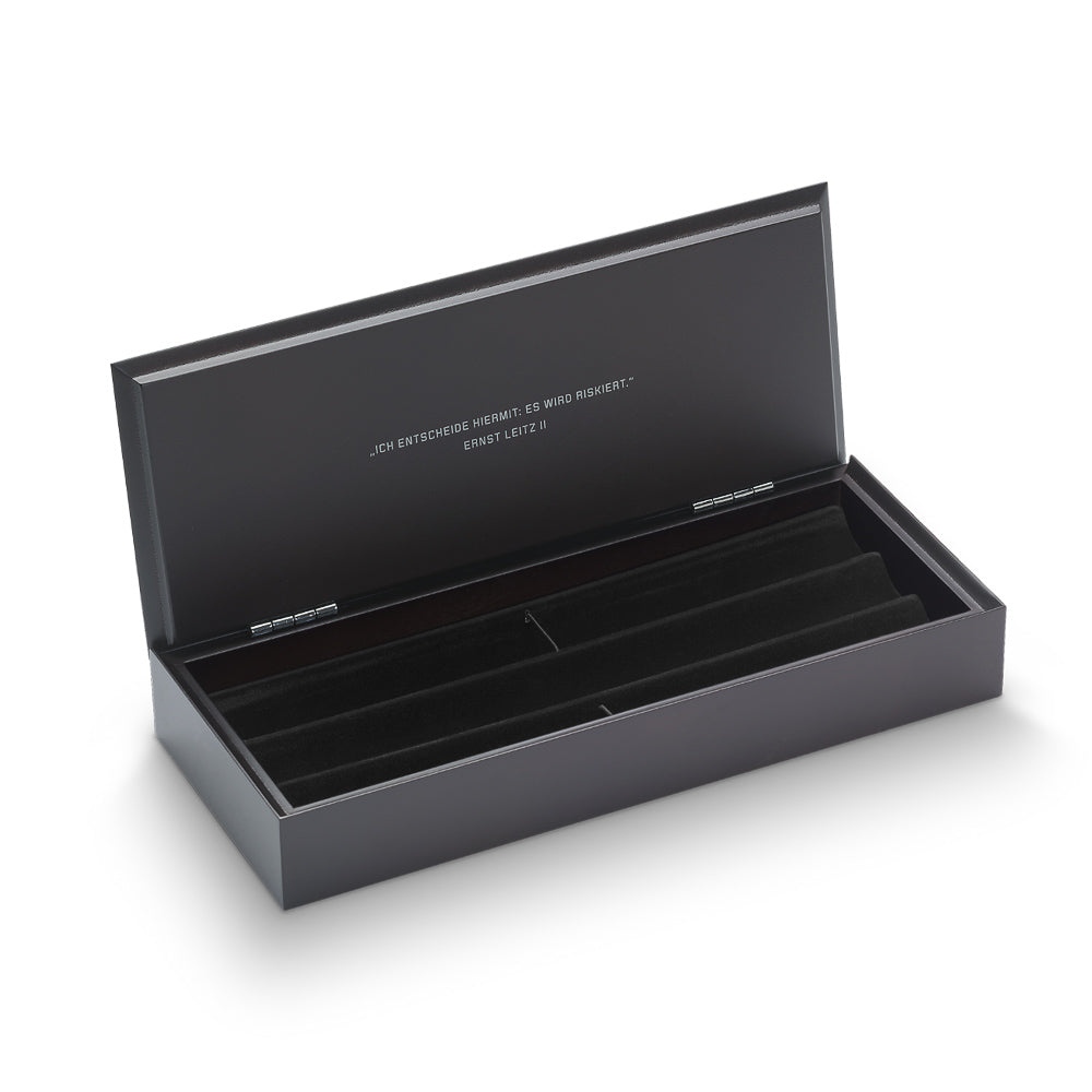 The Perfect Pencil is a true all-rounder, designed for writing, correcting, and sharpening in the most compact conditions. The finely grooved wooden casing, made from premium-quality cedar wood, is topped off with an elegant black, matte chrome-plated brass cap. A sharpener is built into the protective cap, which can also be used to extend the pencil, while an eraser is discreetly hidden beneath the crown at the end. The Leica logo in monochrome appears on the protective cap alongside the engraved limited edition number and famous quote from Ernst Leitz II, “I hereby decide: We will take the risk”, encapsulating Leica’s pioneering spirit.