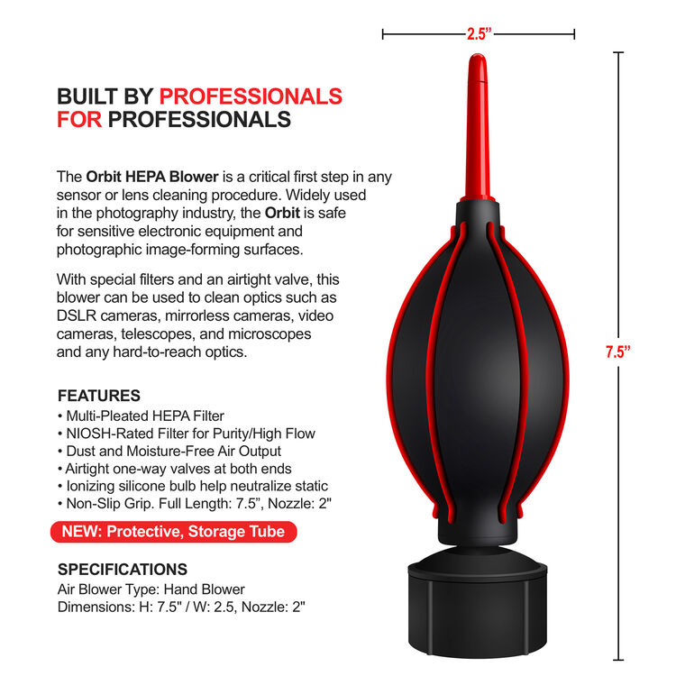 Use the Orbit as a critical first step in any sensor or lens cleaning procedure — offering a dust- and moisture-free air stream to safely remove particles from sensors, lenses, optics, and other sensitive equipment.