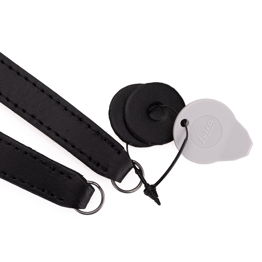 Flat black leather neck strap with small key rings, originally included with Q cameras including the current Q3 and Q3 43. Includes two round leather protector rings and strap removal tool.