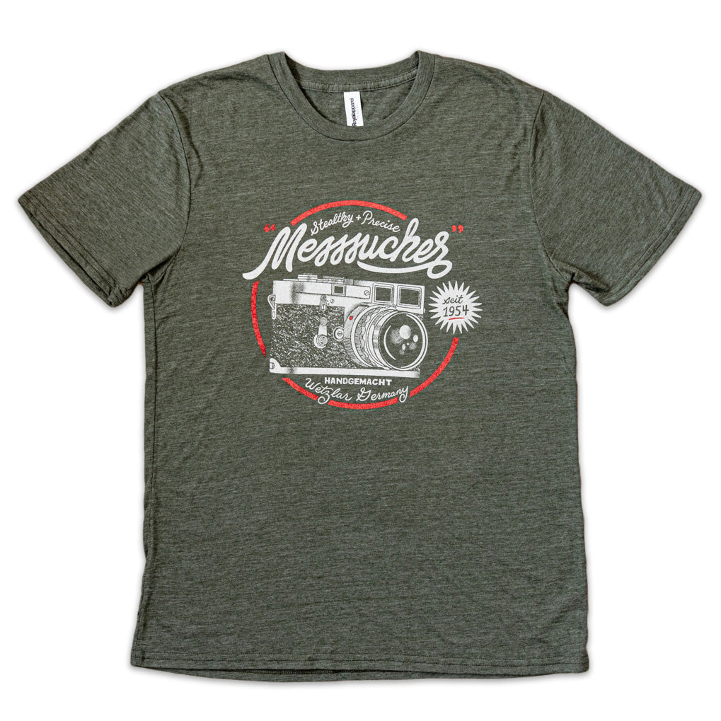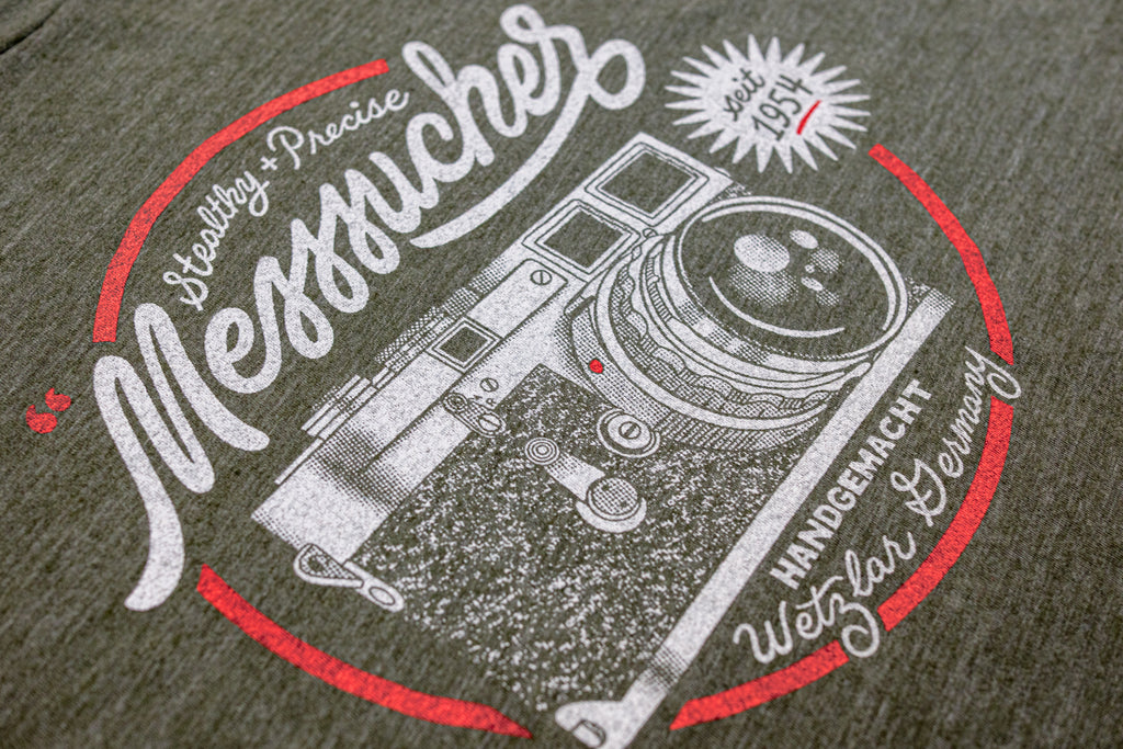 “Messsucher” — German for rangefinder camera and the very word behind the “M” in Leica’s legendary M-System — is featured in retro script, along with other German and English phrases that define the Leica M3.