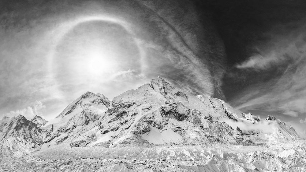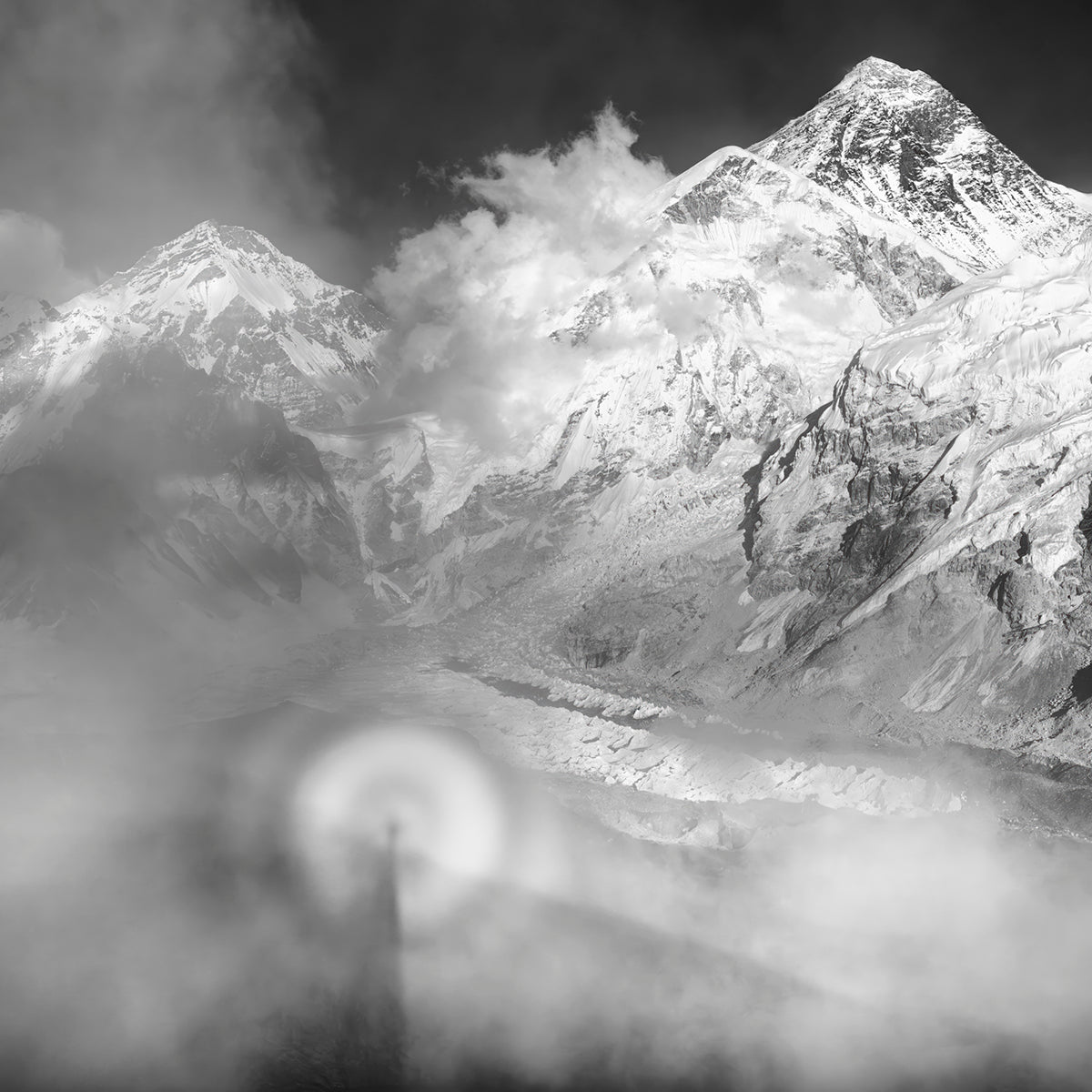 The exhibition is composed of 13 black and white portraits of peaks including Everest, Kangchenjunga, Annapurna, Makalu, Manaslu, Imja, Kangtega and Cholatse. These photographs are a rare synthesis of technological precision, physical endurance, and deep philosophical perspective. They are images that touch us with emotion and awe as they celebrate the power and spirit of the mountains and the people who inhabit them. The luminous prints uplift and inspire viewers to explore their own literal or metaphorical peak experiences and to appreciate the sublime beauty of these rarely photographed heights.