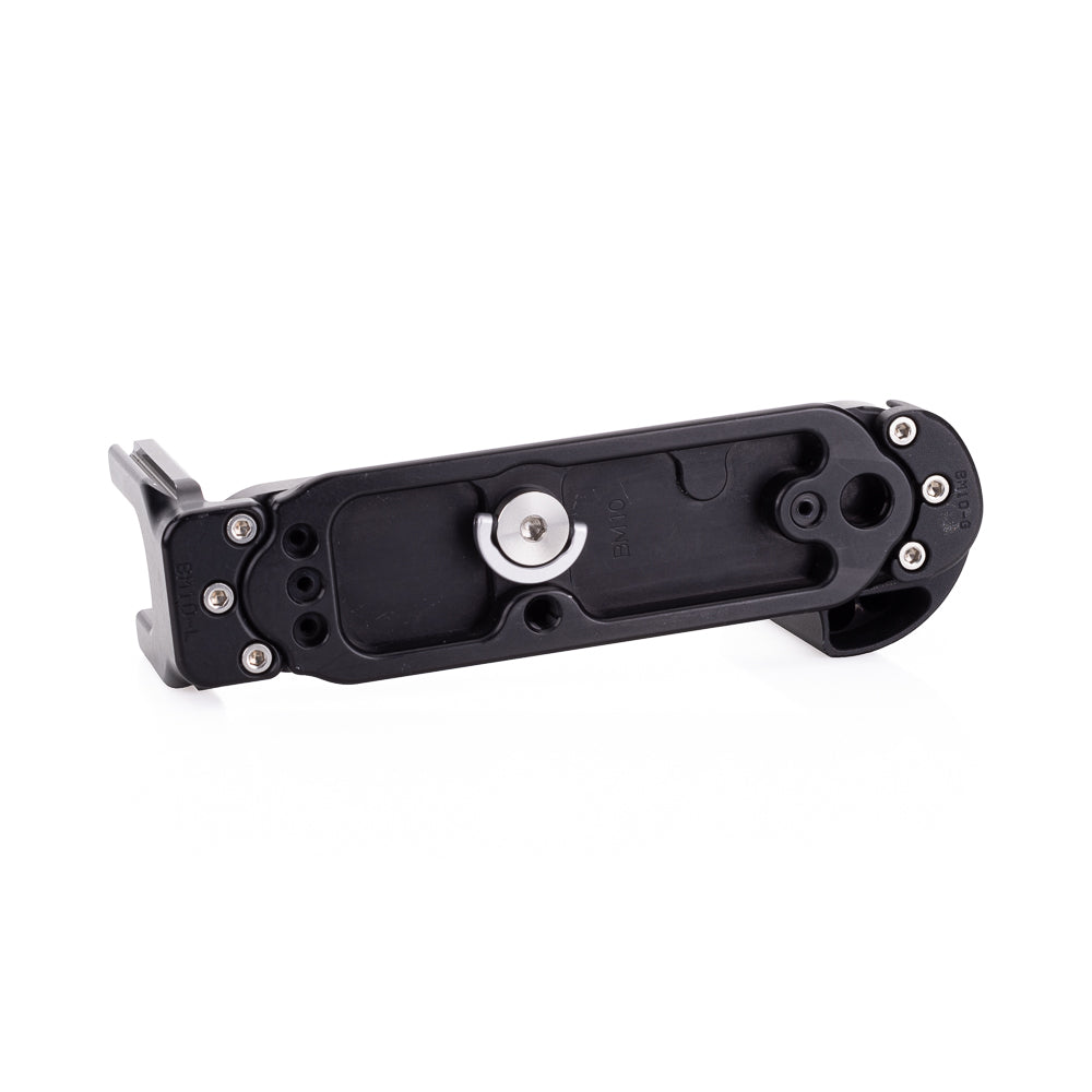 BM10 base replaces the Leica base. As part of a modular system, this replacement base functions as both a base for the bottom of the camera as well as a traditional camera mounting plate, but also has the added flexibility of accepting a separate dedicated vertical L-Component to create a fully modular L-plate with two dovetail mounting surfaces.
