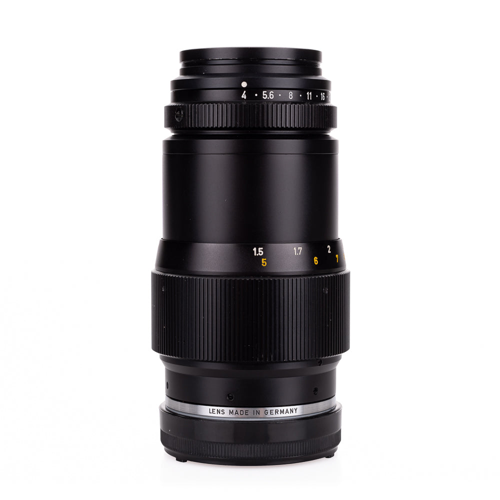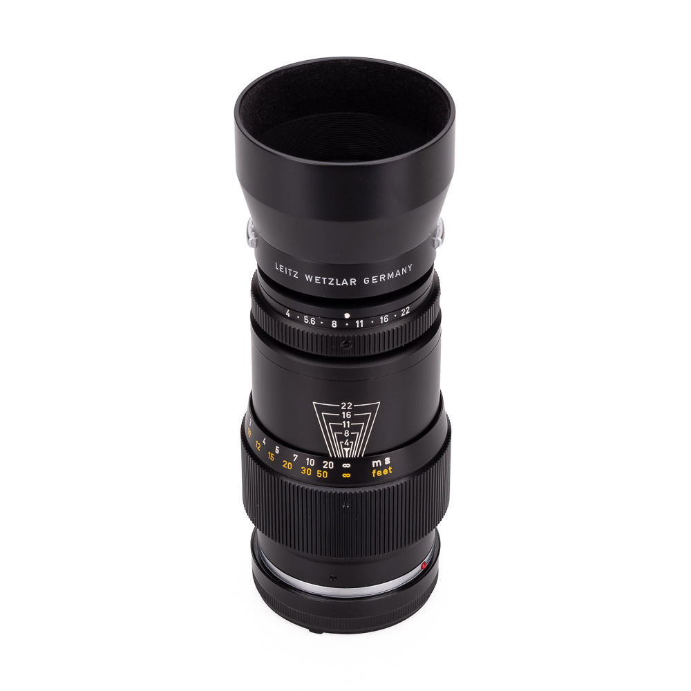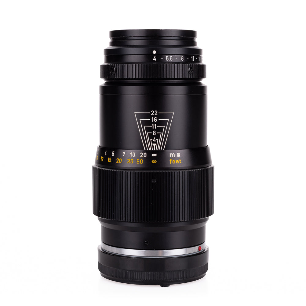 The Tele-Elmar replaced the Elmar of the same focal length as a more compact lens. It is a true telephoto construction with five elements in three groups. The lens head is detachable for use with the Visoflex, but owing to its telephoto construction that no extension tube is required. The lens was made in M-mount only, in black and with click-stop diaphragm ring with half stops. Early lenses had a scalloped focusing ring.