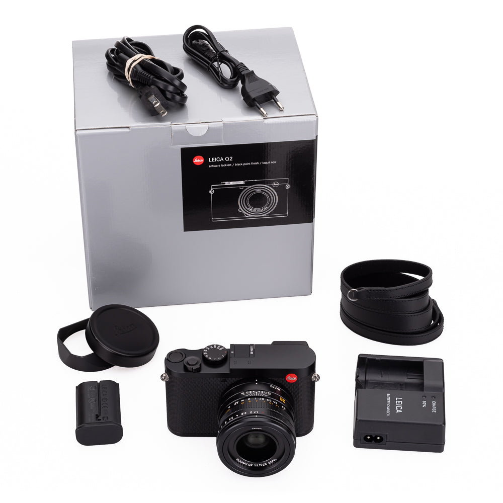 The Leica Q body with the original box, battery, charger (US, EU), lens hood with protective cap, and neck strap.