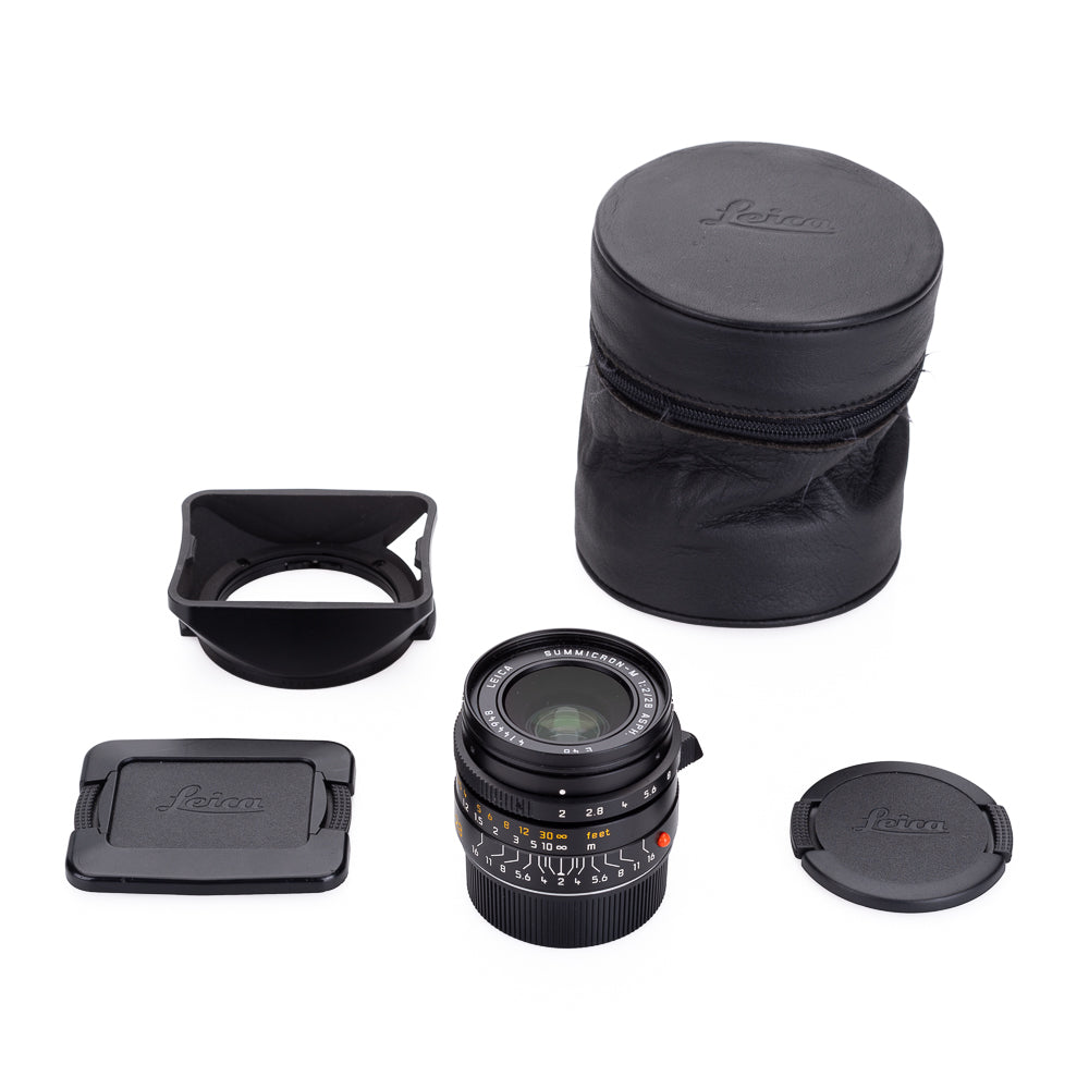 The 28 mm Summicron-M lens with the front and rear protective caps, lens hood with cover, and leather case.