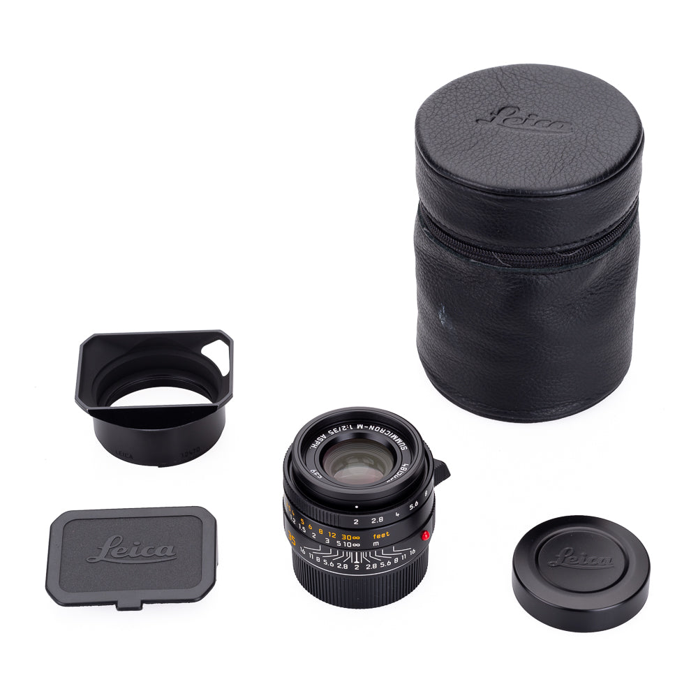 The 35mm Summicron-M lens with the lens hood with cover, front and rear protective caps, and leather case.