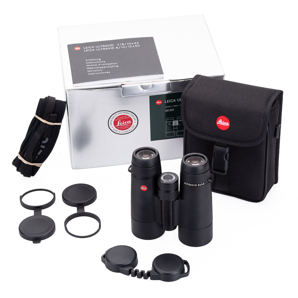 The 8x42 Ultravid binoculars with original box, instructions, eye caps, lens caps, neck strap and carry case.