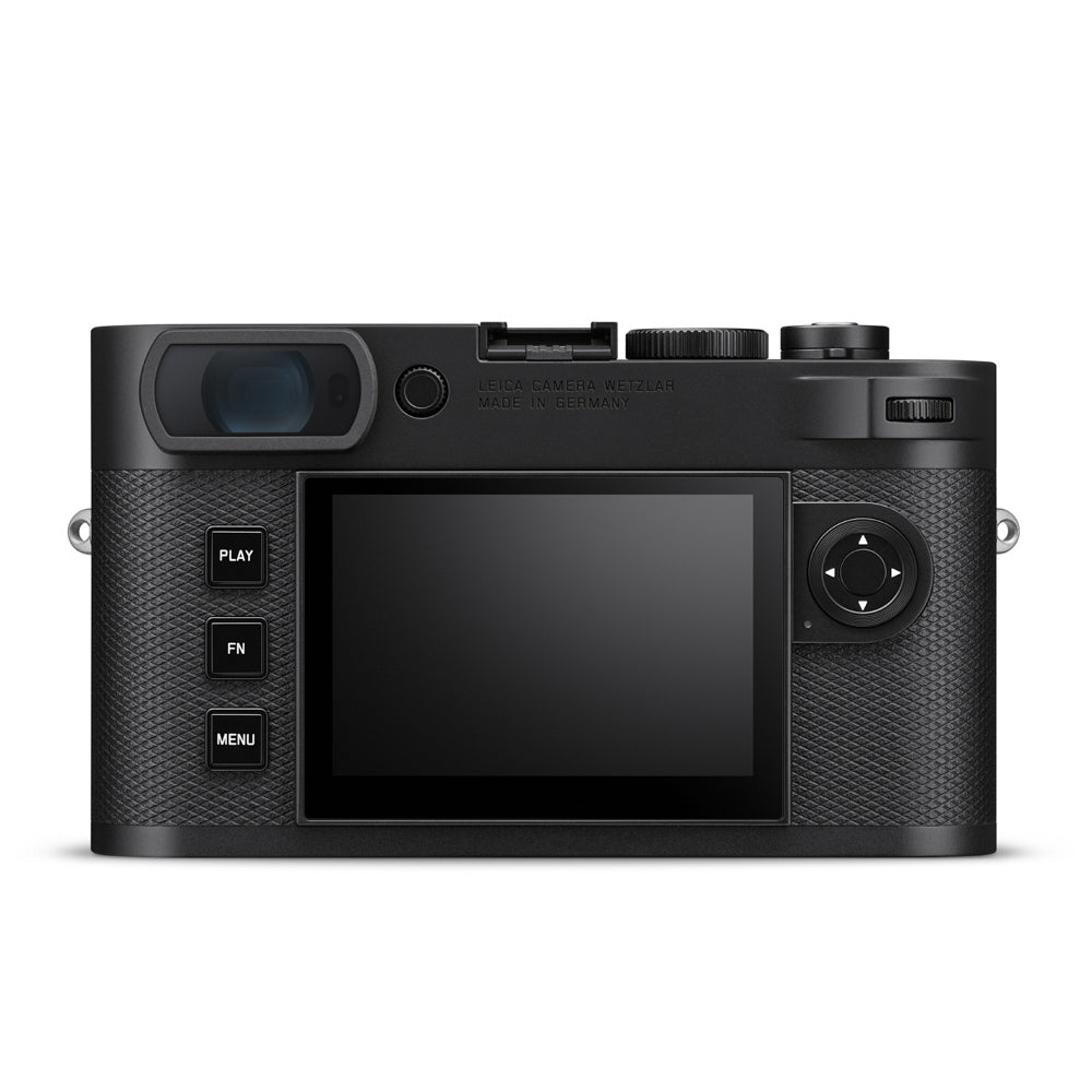 JPG: > 100 shotsStorage medium UHS-II (recommended), UHS-I, SD/SDHC/SDXC memory card (SDXC cards up to 2 TB), internal memory: 64 GB Material Full-metal housing made of magnesium and aluminum, leatherette cover Lens mount Leica M bayonet with additional sensor for 6-bit encoding Operating conditions 0°C to +40°C Interfaces ISO accessory shoe with additional control contacts for Leica flash units and USB 3.1 Gen1 Type C Tripod thread A 1⁄4 DIN 4503 (1⁄4”) with stainless steel in the base Dimensions 138.8 mm × 80.3 mm × 38.45 mm Weight approx. 484 g/402 g (with/without battery) Sensor size BSI CMOS sensor, pixel pitch: 3.76 µm, 35 mm: 9528 x 6328 pixels (60.3 MP) Processor Leica Maestro series (Maestro III) Filter RGB color filter, UV/IR filter, no low-pass filter File formats DNG™ (raw data, loss-free compression), DNG + JPG, JPG (DCF, Exif 2.30) Image resolution DNG™ L-DNG 60.3 MP 9528 x 6328 pixels